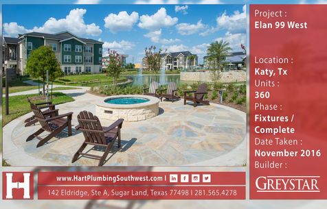 In 2016, Greystar completed a luxury multi-family development, Elan 99 West, in Katy, Texas with their partners at Hart Plumbing Southwest. . This project was completed in November 2016.